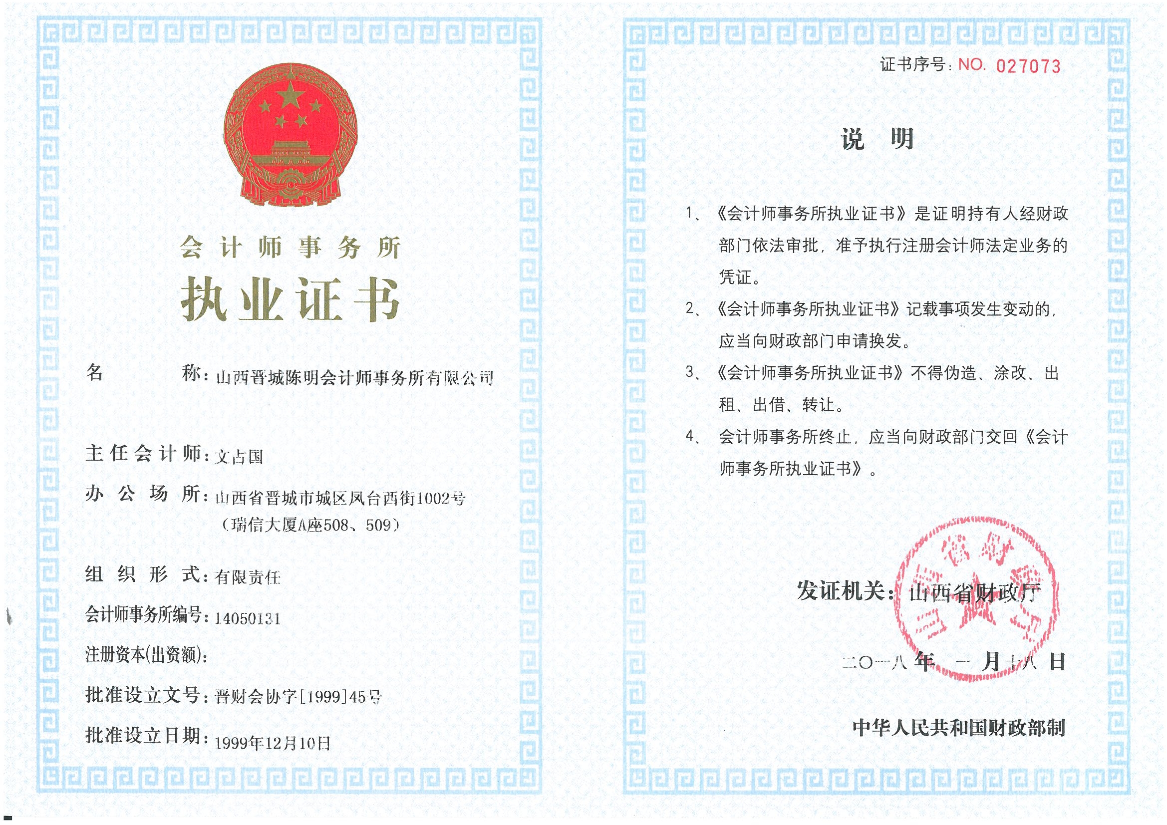 會計師事務(wù)所執(zhí)業(yè)證書